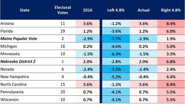 In 2016 the average polling error was 4.8% in the presidential election. There were a lot of close states and using this error we can see just how many states could have gone the other way. I put together a table showing actual vote margin, and then what the polls could have shown if we are assuming a uniform 4.8% error in either direction.