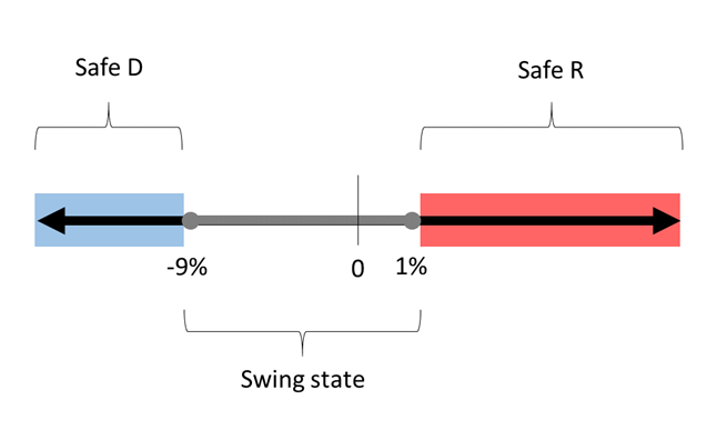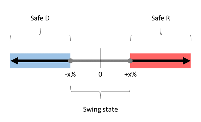I decided I would tinker around with this cutoff point in various simulations. We will break all the states into three categories – Safe D (100% chance D wins, Safe R (100% chance R wins), and Swing (coin flip between candidates). We will let x% be our cutoff point.