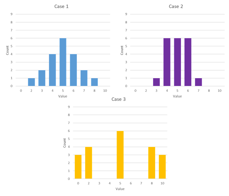 Case three: is a mess. Lots of extreme values, but it all averages out still to be 5. Range is 0-10.