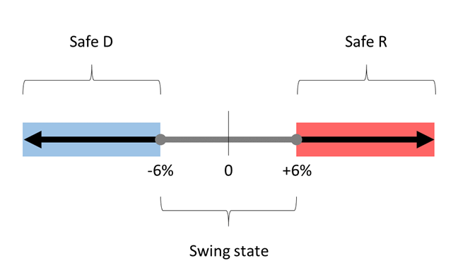 I wanted to set some parameters and separate those states that safely belonged to one party versus potential swing states. I also wanted to make the boundaries between states crystal clear. Other models use various distinctions like “Safely Democratic, Likely Democratic, Leaning Democratic, Swing, Leaning Republican, Likely Republic, Safely Republican” all with different polling cutoffs. Few models agree where these cutoffs are. Advanced models too will project certain odds based on these categories or polling margins.
