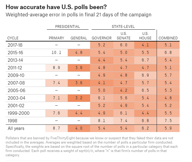 I will attempt to very briefly summarize some of the pitfalls of 2016. For a deeper dive, consider reading FiveThirtyEight’s 2018 article: The Polls Are All Right.